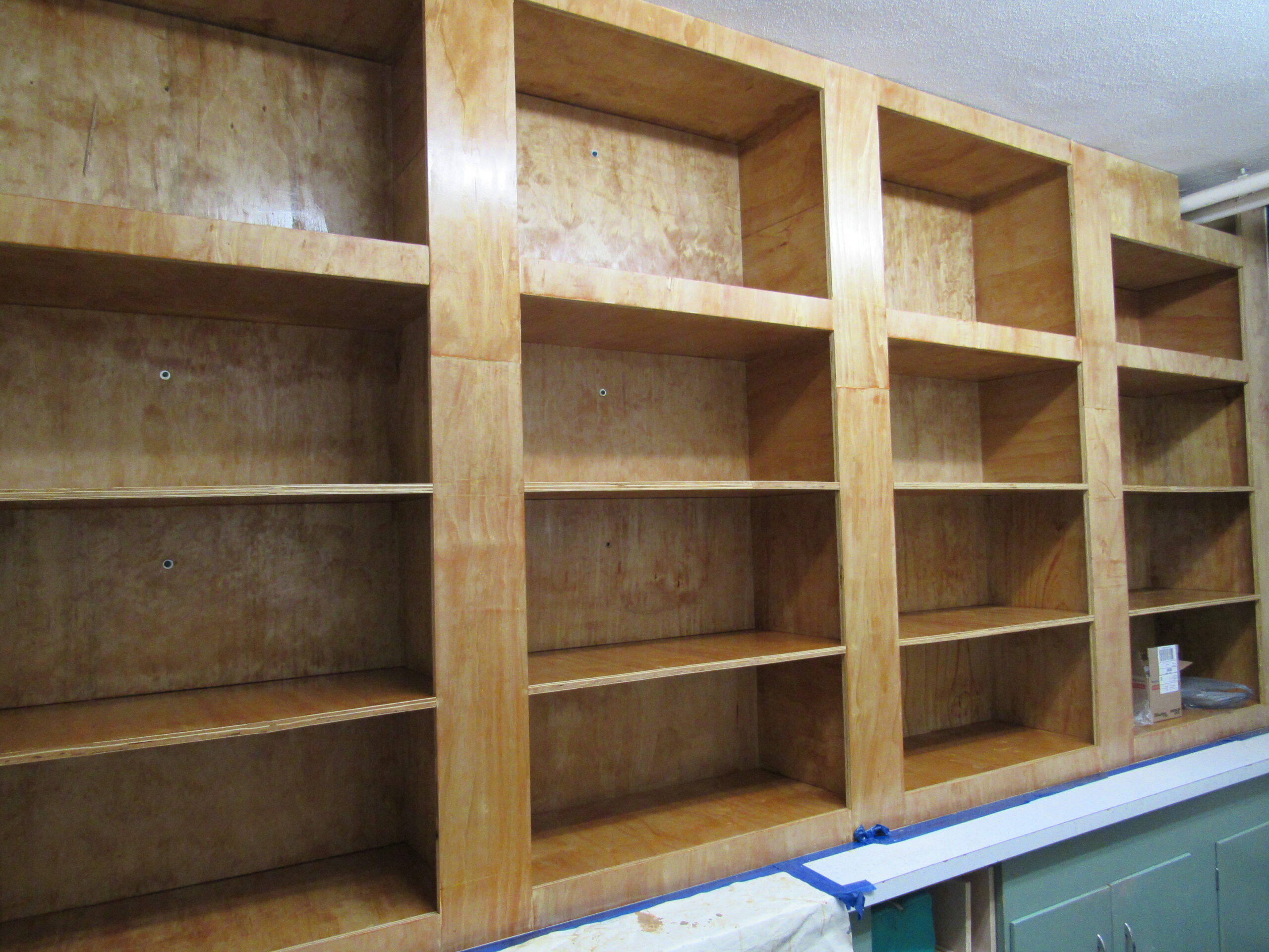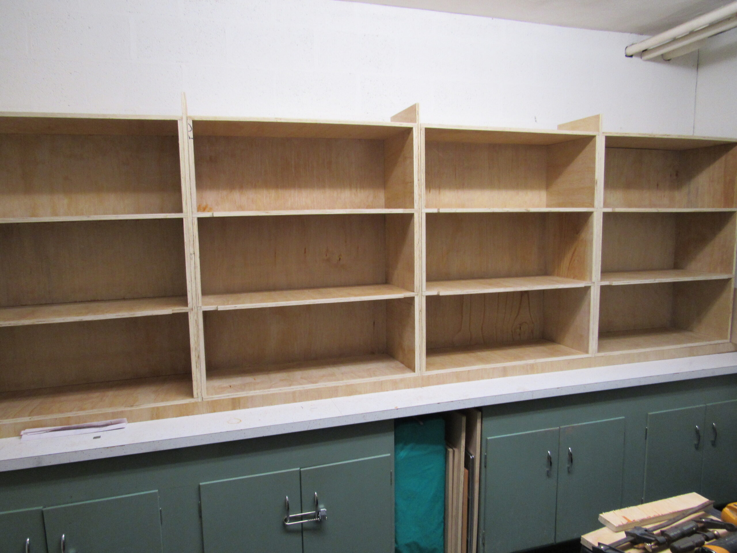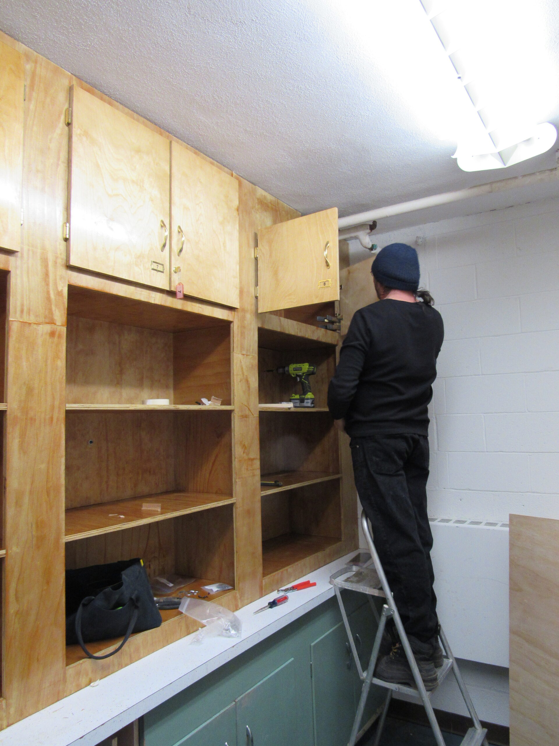 The solution was clear: floor to ceiling, strudy wooden cabinets for all… with locks! We chose to use birch plywood which was both attractive and durable. We built cabinets all the way to the ceiling, with as many shelves as possible. Click on any of these thumbnails for details.